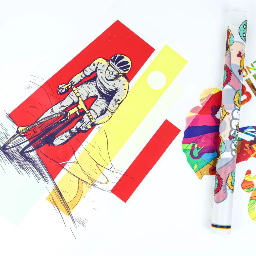 se realiza sobre un Film transparente (película PET), para posteriormente transferir la impresión a la prenda mediante una plancha de calor.